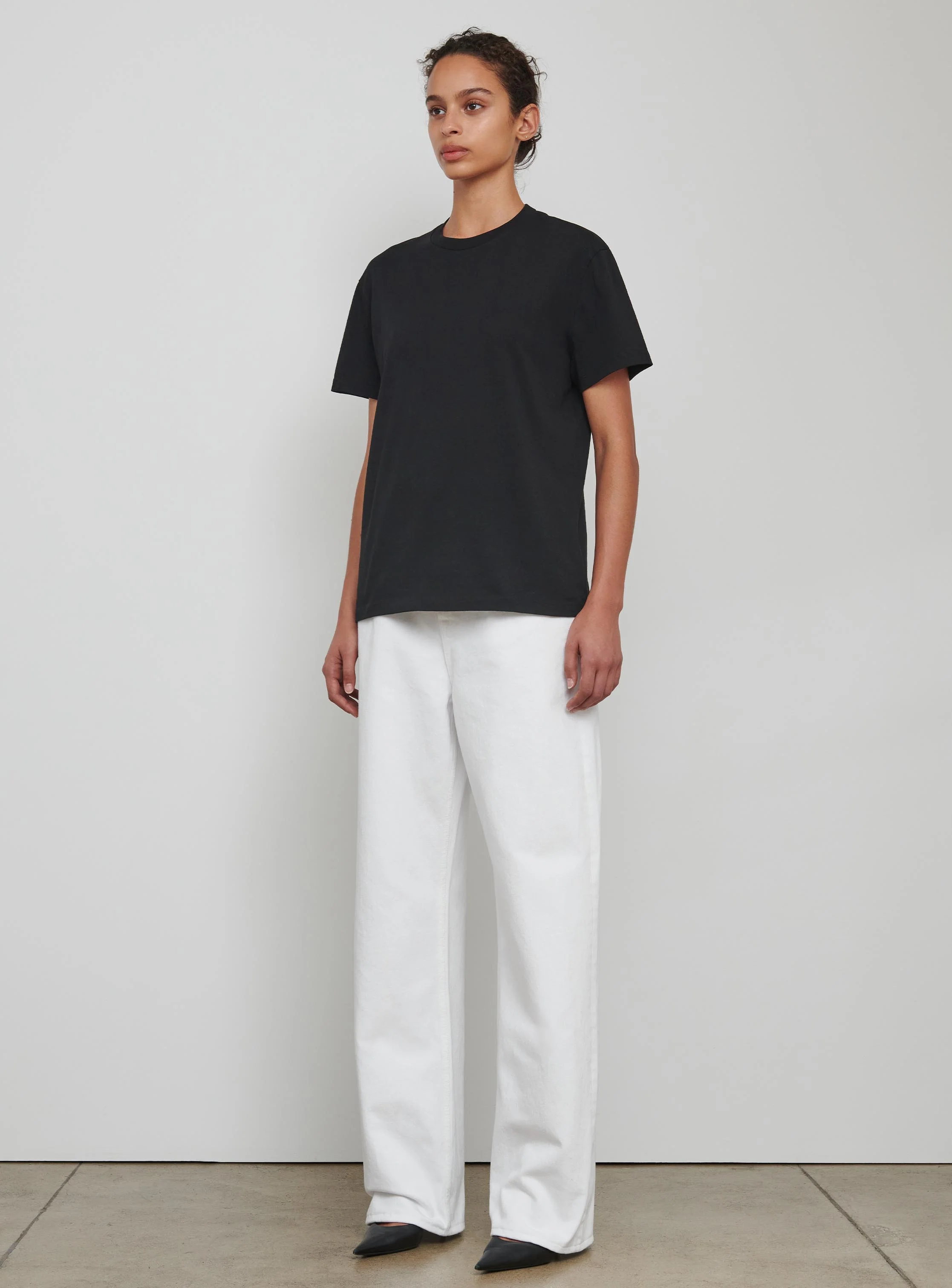 - A classic t-shirt with relaxed cut, designed to sit off the body, finishing at the low hip, cut in a medium weight cotton.