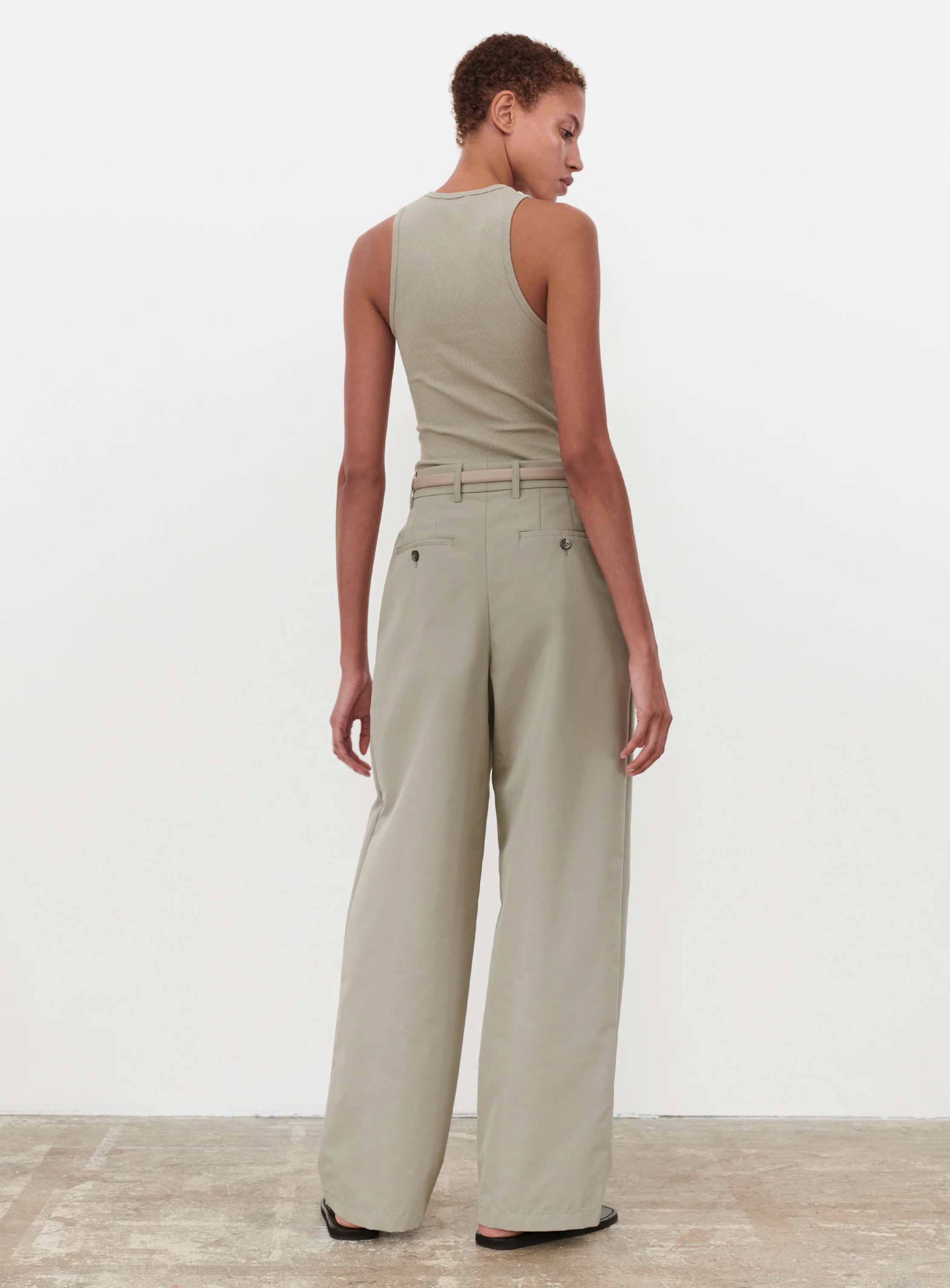 - A crisp chino in densely woven Italian technical cotton with structured drape. Features waisted fit with straight leg silhouette. Belt loops, side slit pockets, back welt pockets, and double pleats enhance the tailored profile. Zipper fly completes the classic construction.