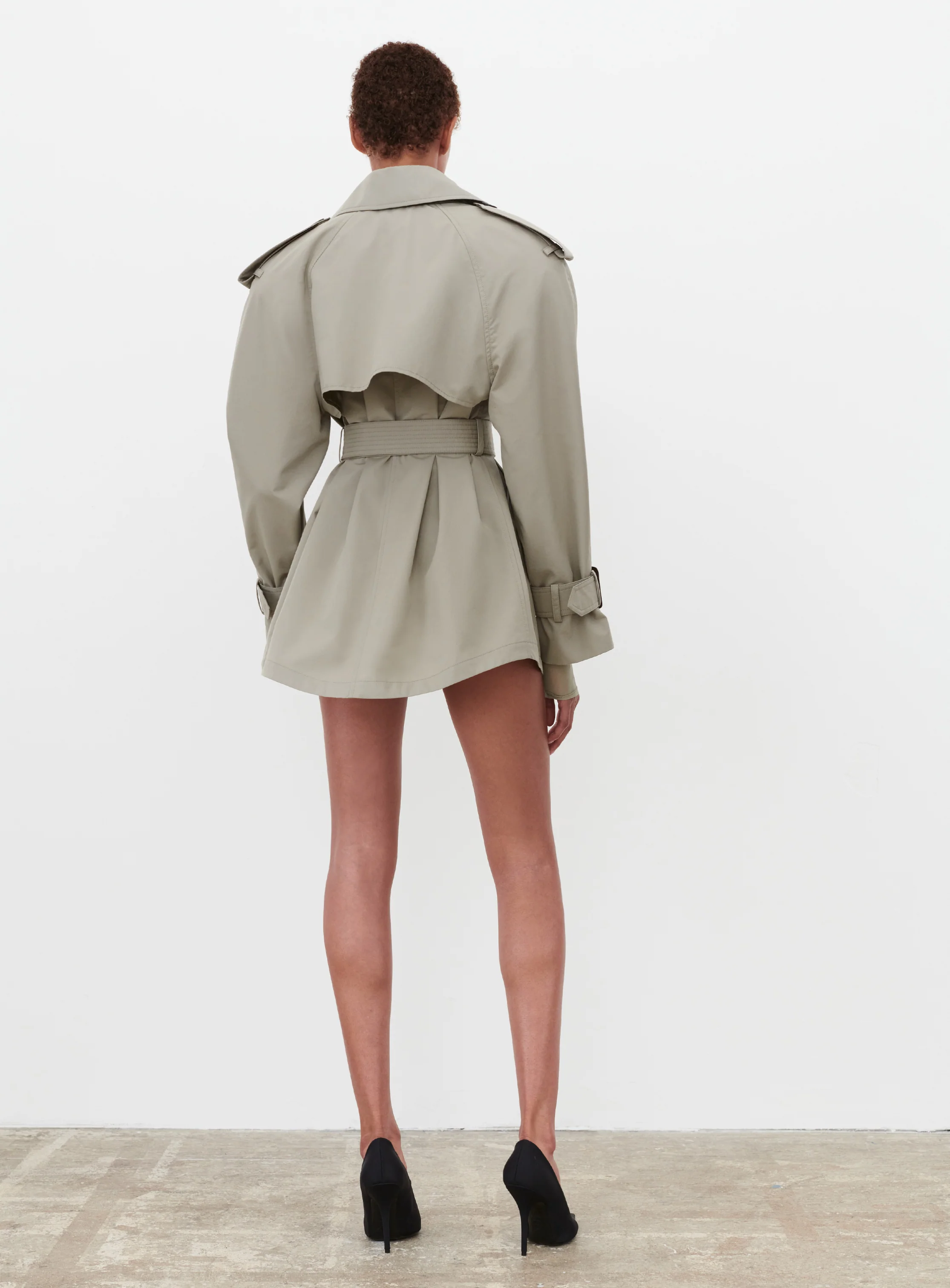 - A sculptural Trench Mini in densely woven Italian technical cotton with crisp hand. Features an hourglass silhouette with squared shoulders. Classic trench detailing includes double-breasted closure, front storm flap, back storm shield, epaulettes, adjustable cuff straps, back vent, and belted waist.Â