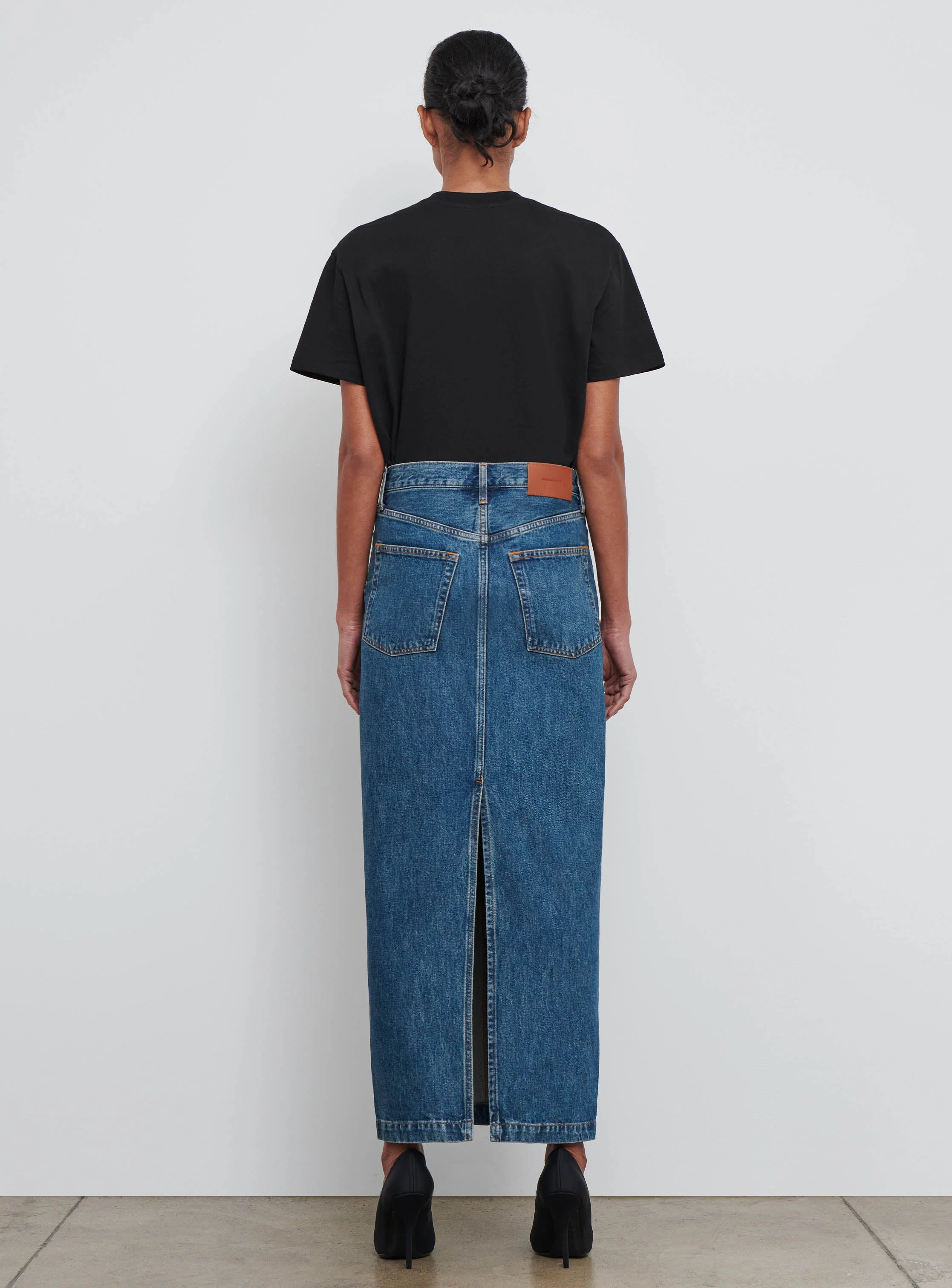 - A signature Denim Column Skirt designed with mid rise fit and finish at the ankle with a center back split. Cut in a 3x1 right hand twill, 14-ounce denim. Featuring classic denim details including a button fly closure with metal shanks, scoop front pockets with metal rivets, and contrast top stitching. Pair with the Denim Jacketor Ribbed Tank.