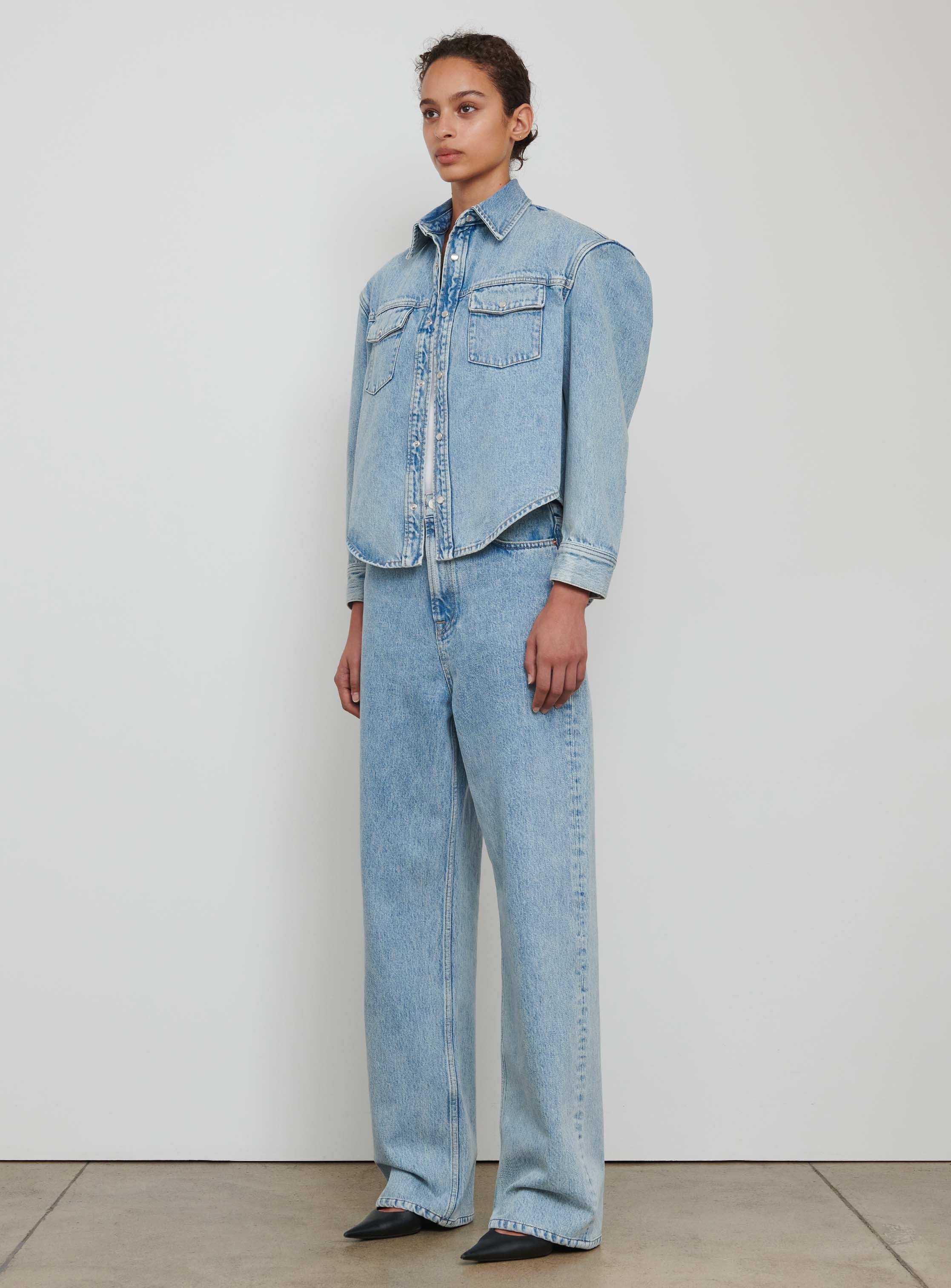 - Designed to wear oversize, with square shoulders, and curved hem finishing at high hip. Cut in a 3x1 right-hand twill 14 ounce denim, with front and back yoke, patch pockets, faux pearl snap closures, and a heavy topstitch detail in contrast tobacco thread. Pair with the Denim Low Rise Jean or Denim Micro Mini Skirt.