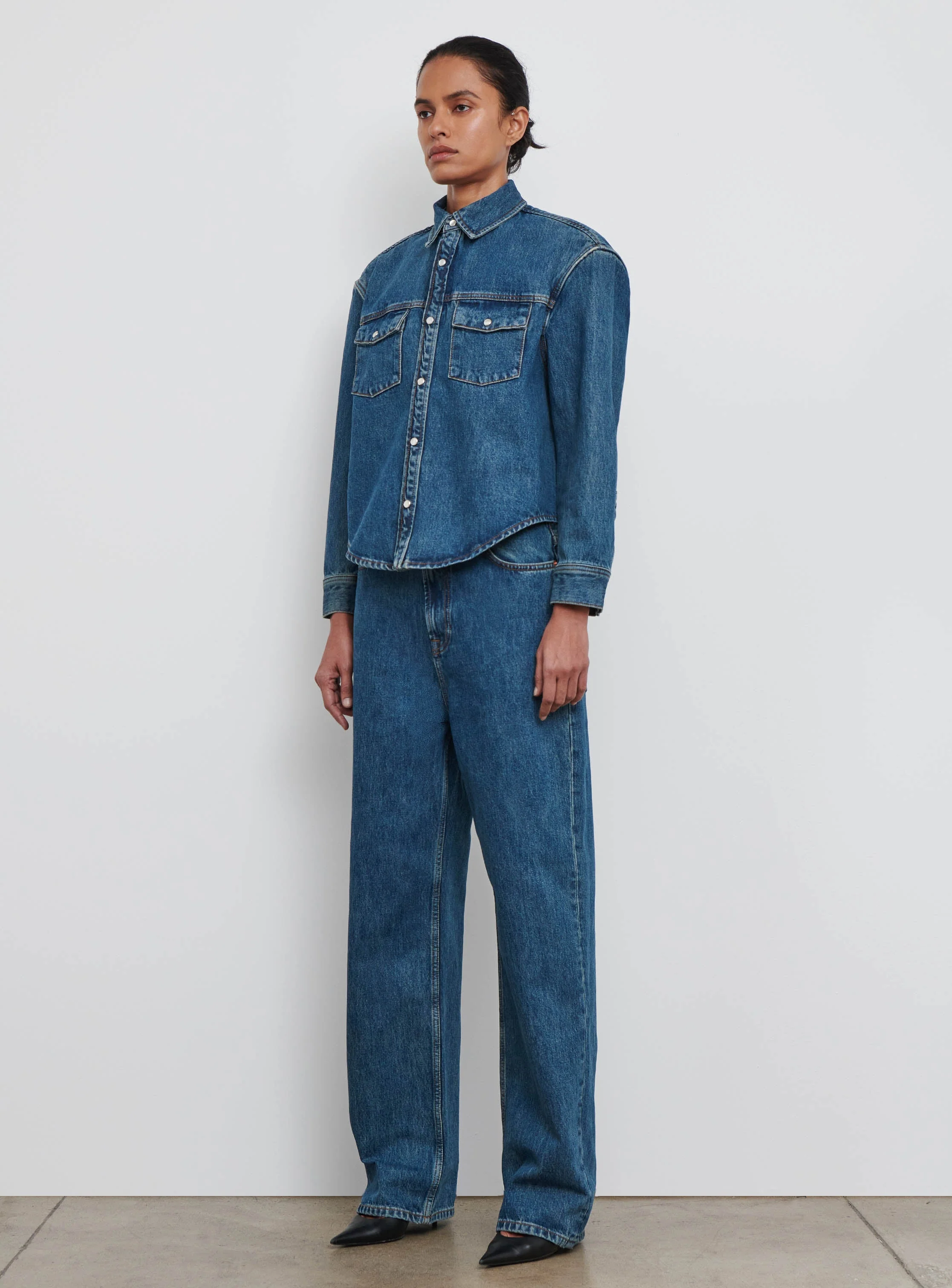 - Designed to wear oversize, with square shoulders, and curved hem finishing at high hip. Cut in a 3x1 right-hand twill 14 ounce denim, with front and back yoke, patch pockets, faux pearl snap closures, and a heavy topstitch detail in contrast tobacco thread. Pair with the Denim Low Rise Jean or Denim Micro Mini Skirt.