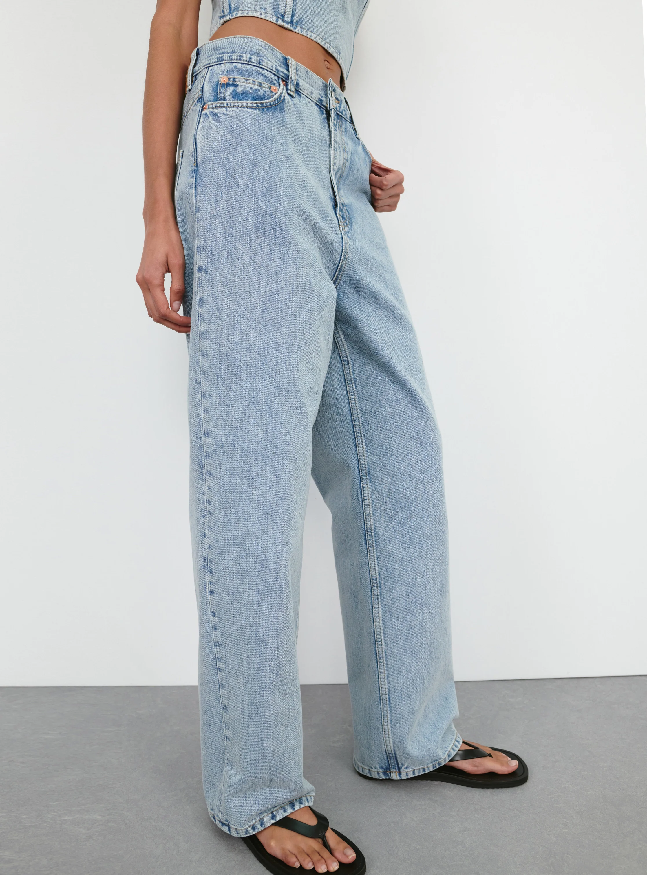 - Sits at hip with long rise and inseam