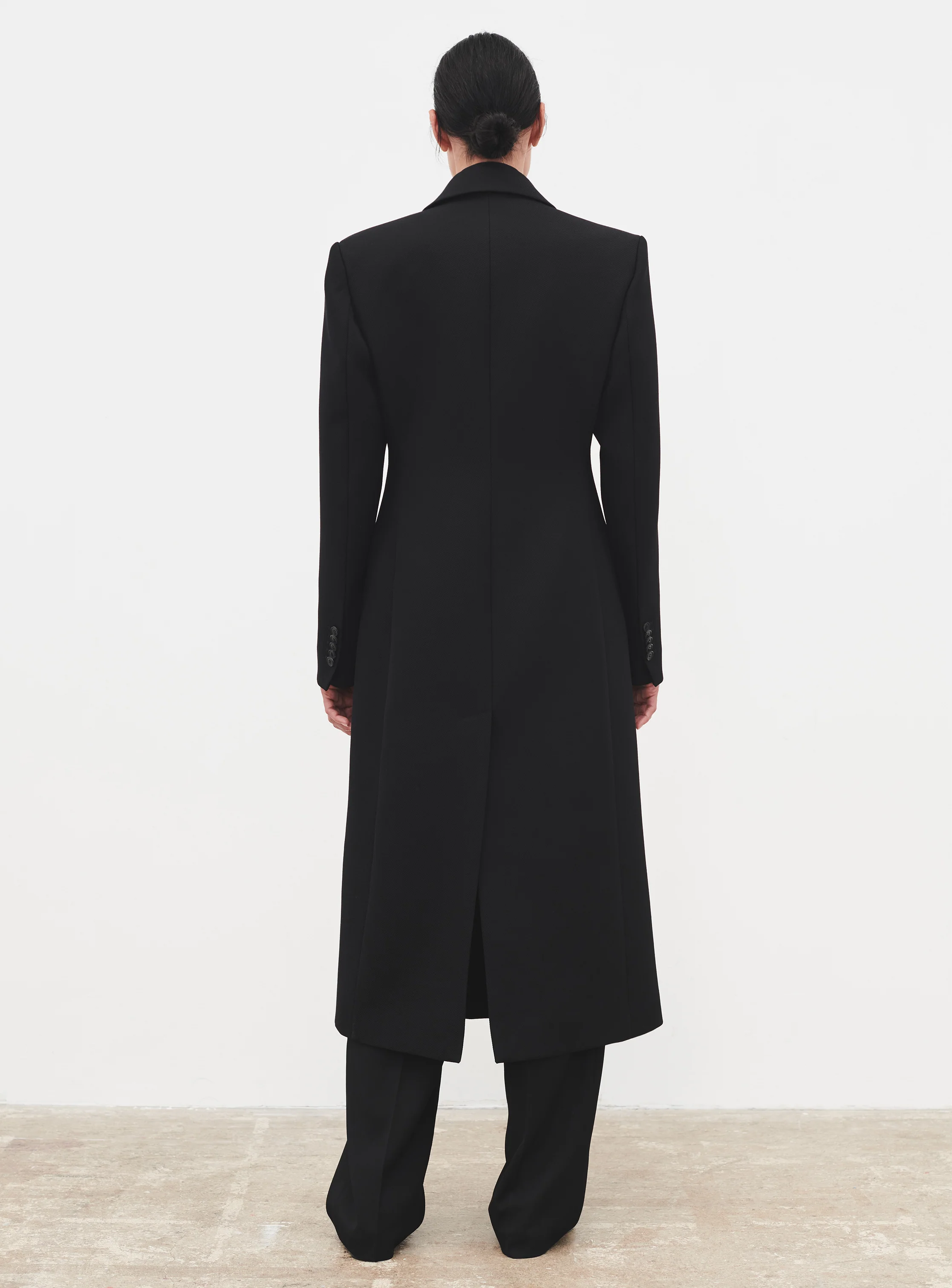 - A sculptural coat, with defined shoulders, elongated line, and subtle hourglass silhouette. Crafted in a hardy Merino wool twill, and cut to the mid-calf.