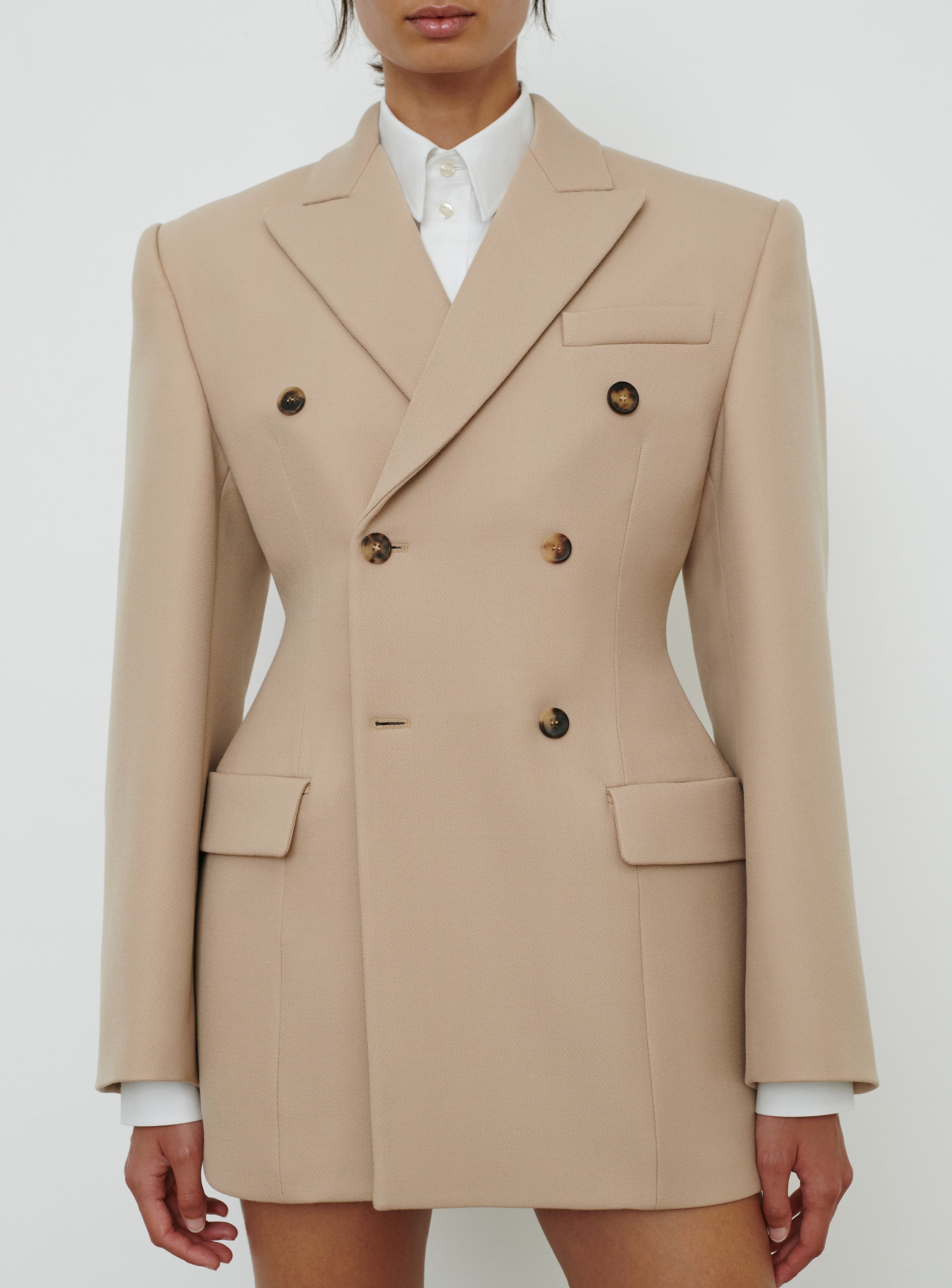 - An impeccable tailored blazer designed with a sculptural hourglass silhouette. The new Double Breasted Contour Blazer is cut in a robust wool suiting with precise design lines, and finishes. Elongating and versatile, it can be worn as a mini dress, or paired with the Contour Mini Skirt.