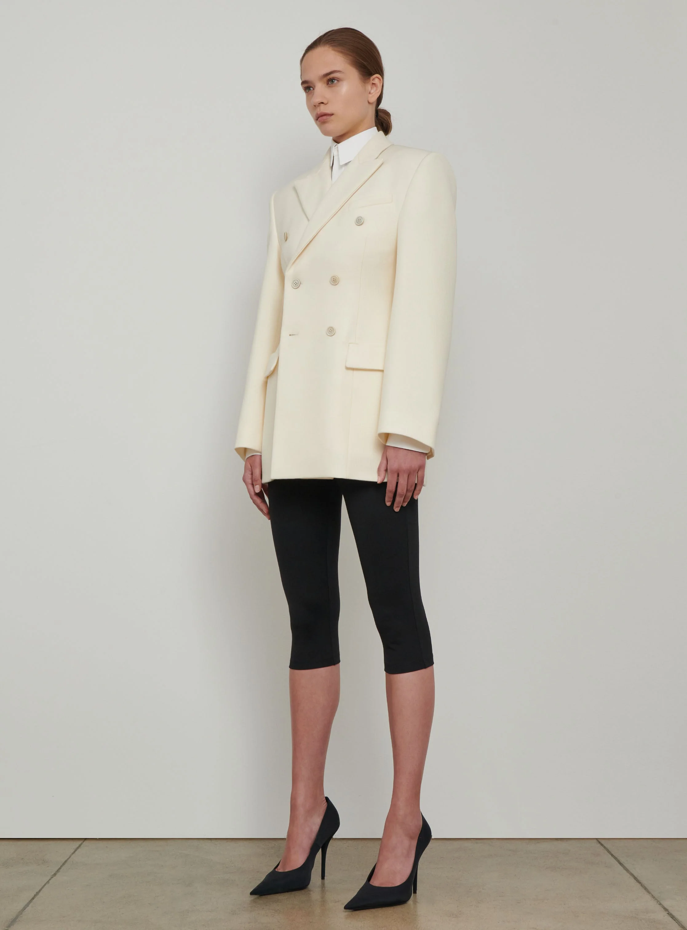 - An impeccable tailored blazer designed with a sculptural hourglass silhouette. The new Double Breasted Contour Blazer is cut in a robust wool suiting with precise design lines, and finishes. Elongating and versatile, it can be worn as a mini dress, paired with a pant to create an elevated suit, or skirt for evening.