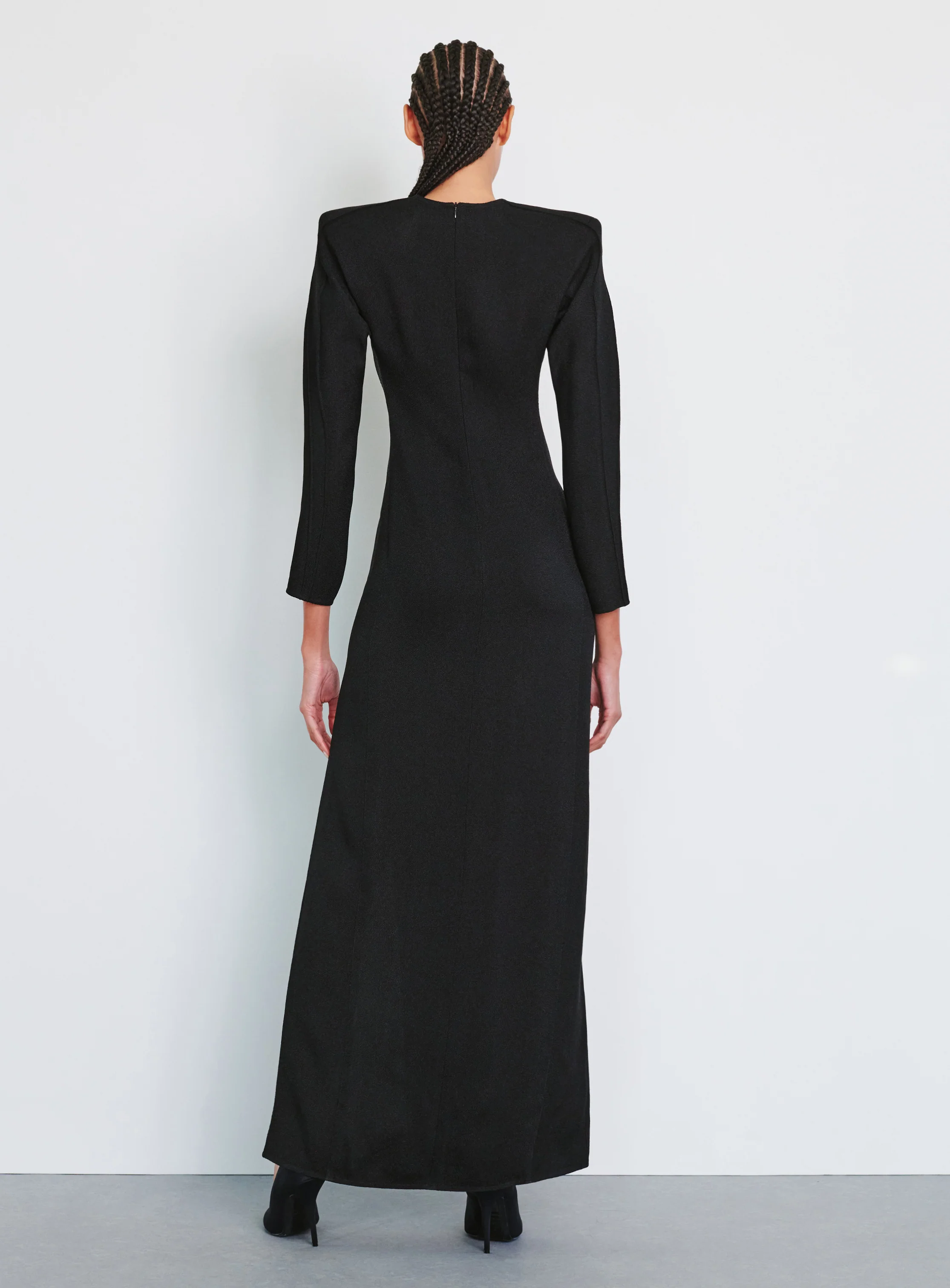 A refined full-length dress in textured Italian virgin wool crepe with rich, artisanal finish. Features signature silhouette with jewel neckline, padded square shoulders, and long sleeves with center back zip closure. Front slit ensures ease of movement.