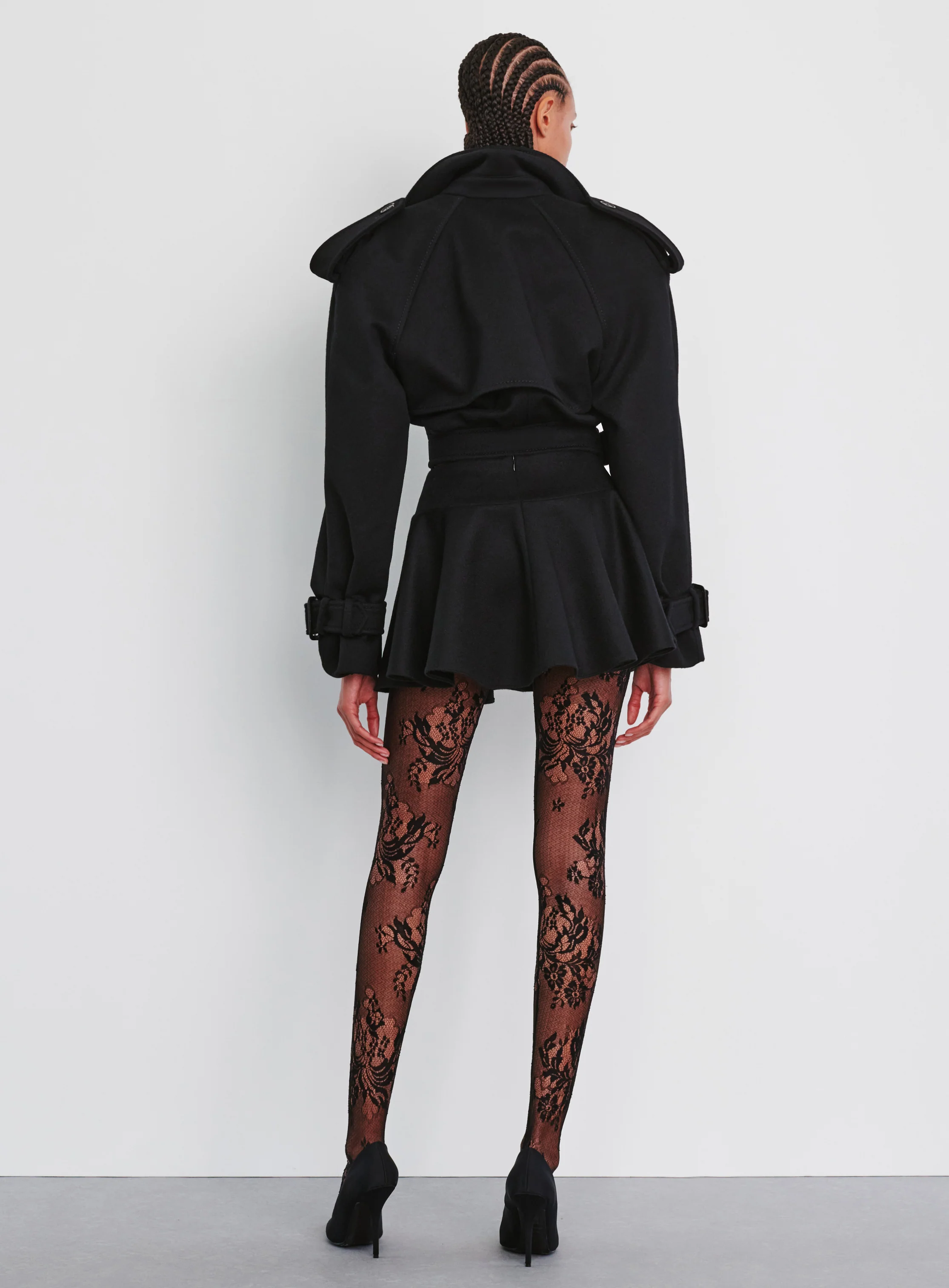 - Our best-selling silhouette crafted in a plush Italian brushed wool, the Evening Perfecto is an elevated transitional piece that can take you from day to night. Defined by it's cropped waist and statement shoulders, featuring wide lapels and fixed belt with buckle closure. Detailed with welt pockets, epaulettes, adjustable cuff straps, and storm flap