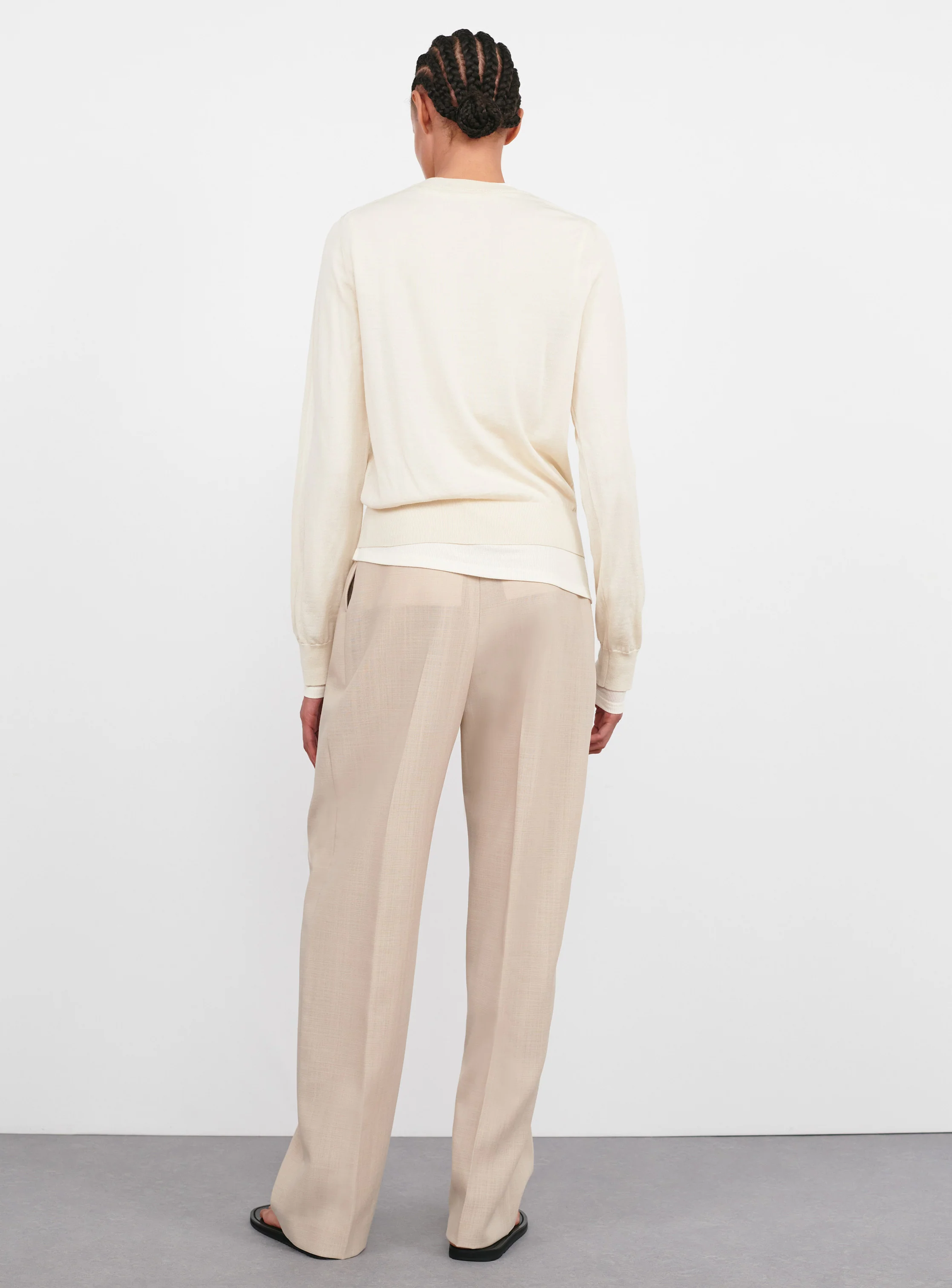 - A delicate sweater, designed with a slightly loose silhouette and fine gauge construction. Knit in Italian ultra-fine merino wool selected for its soft hand and semi-sheer quality. Features include signature fashioning marks around the neckline and armhole that highlight the craftsmanship. The ribbed hemline and cuff offer refined finishing.Β