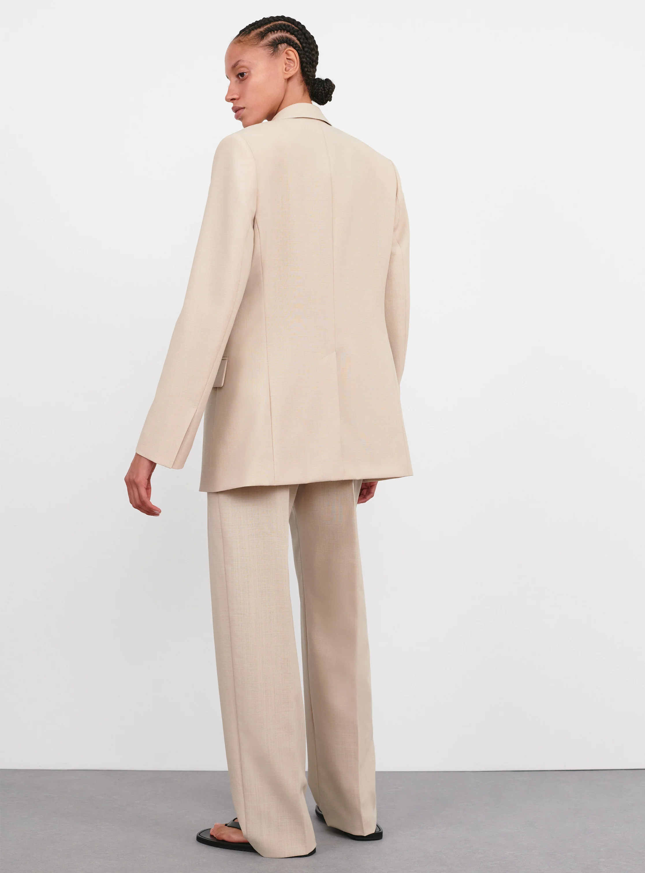 - A refined longline blazer, designed with a slim, easy silhouette and artisanal finish. Cut in Italian virgin wool suiting chosen for its subtle malfilĂ© texture and lightly textured hand. Features include a three-button closure, classic notch lapel, and welt pockets with flap detailing.Â