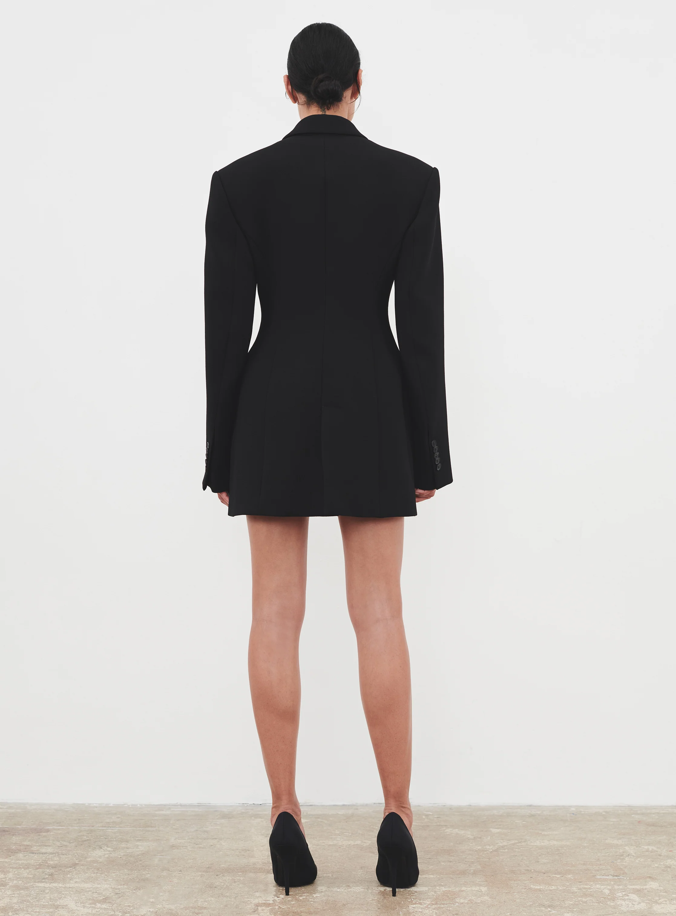 - A single-breasted blazer designed with an elongated fit. Cut in a bonded, Italian wool suiting. Featuring a 3-button closure, sharp shoulder lines, contoured waist, and flap welt pockets.