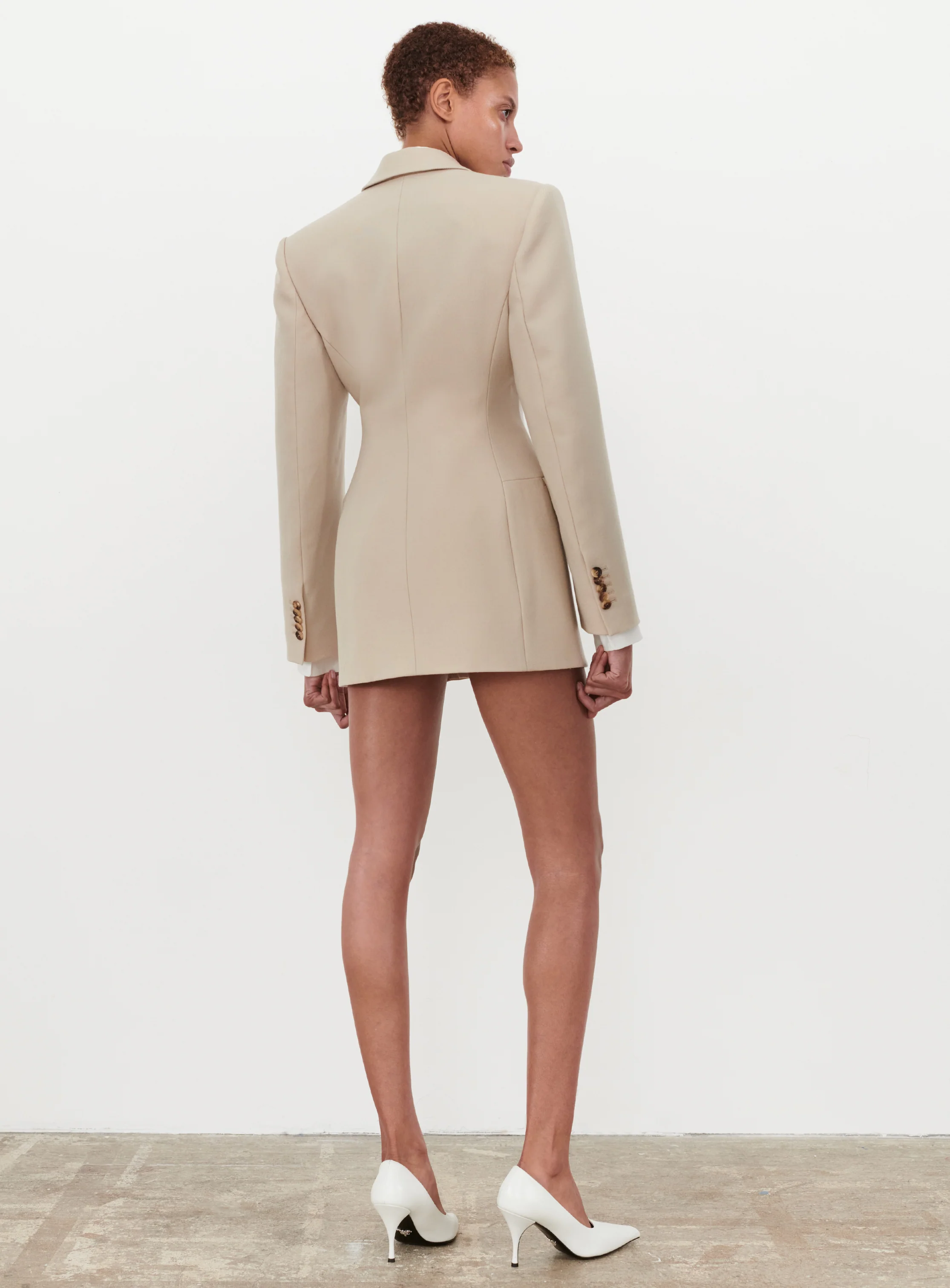 - An impeccable tailored blazer designed with a sculptural hourglass silhouette. The New Double Breasted Contour Blazer is cut in a robust wool suiting with precise design lines, and finishes. Elongating and versatile, it can be worn as a mini dress, paired with a trouser to create an elevated suit, or skirt for evening.