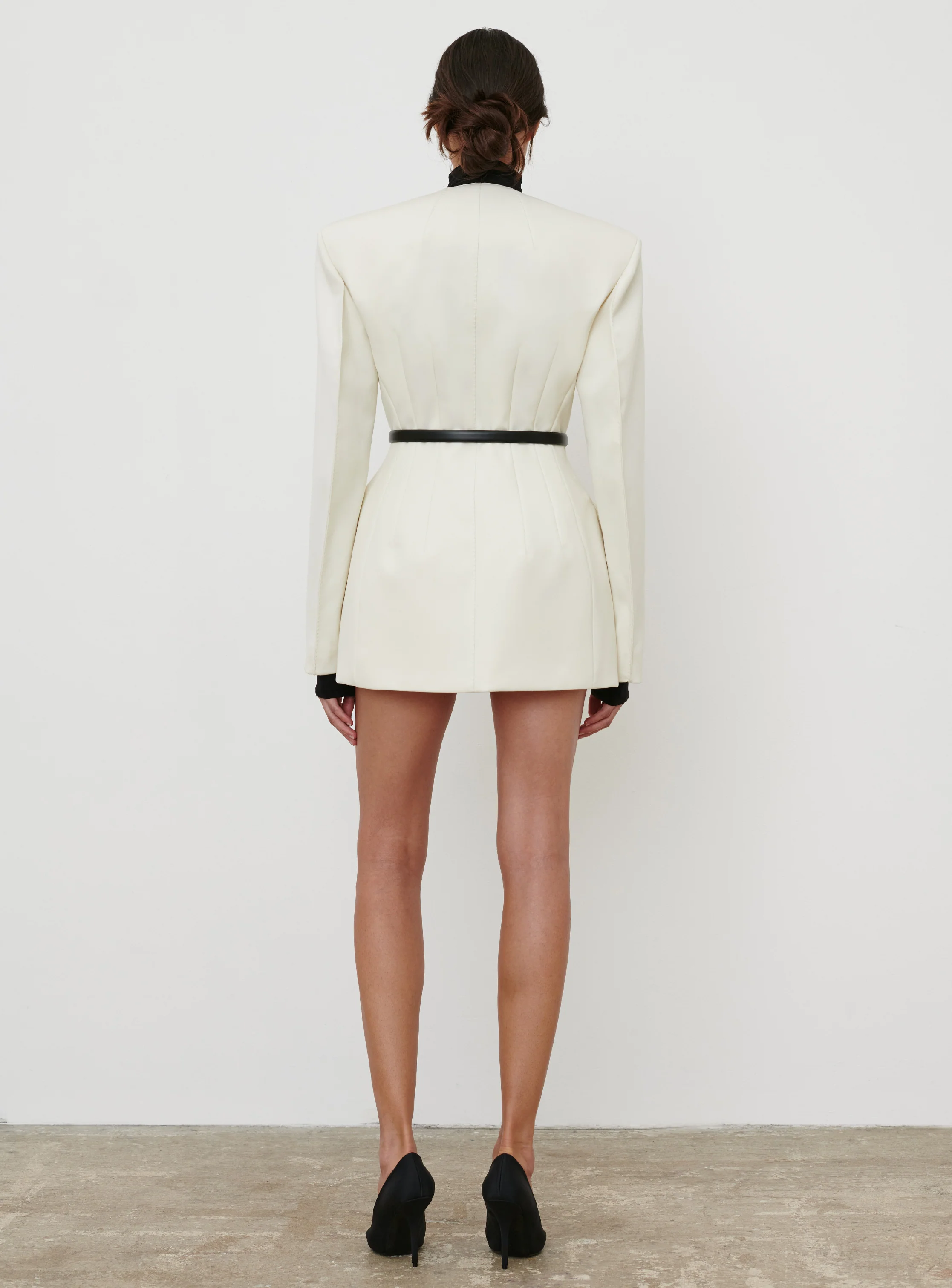 - The RHW Blazer Dress is designed with a sculptural silhouette that enhances the wearer’s natural shape. Crafted in a technical Italian wool blend, the RHW Blazer elevates classic tailoring with a statement shoulder, precisely engineered darts, a collarless neckline, and double breasted closure.Â