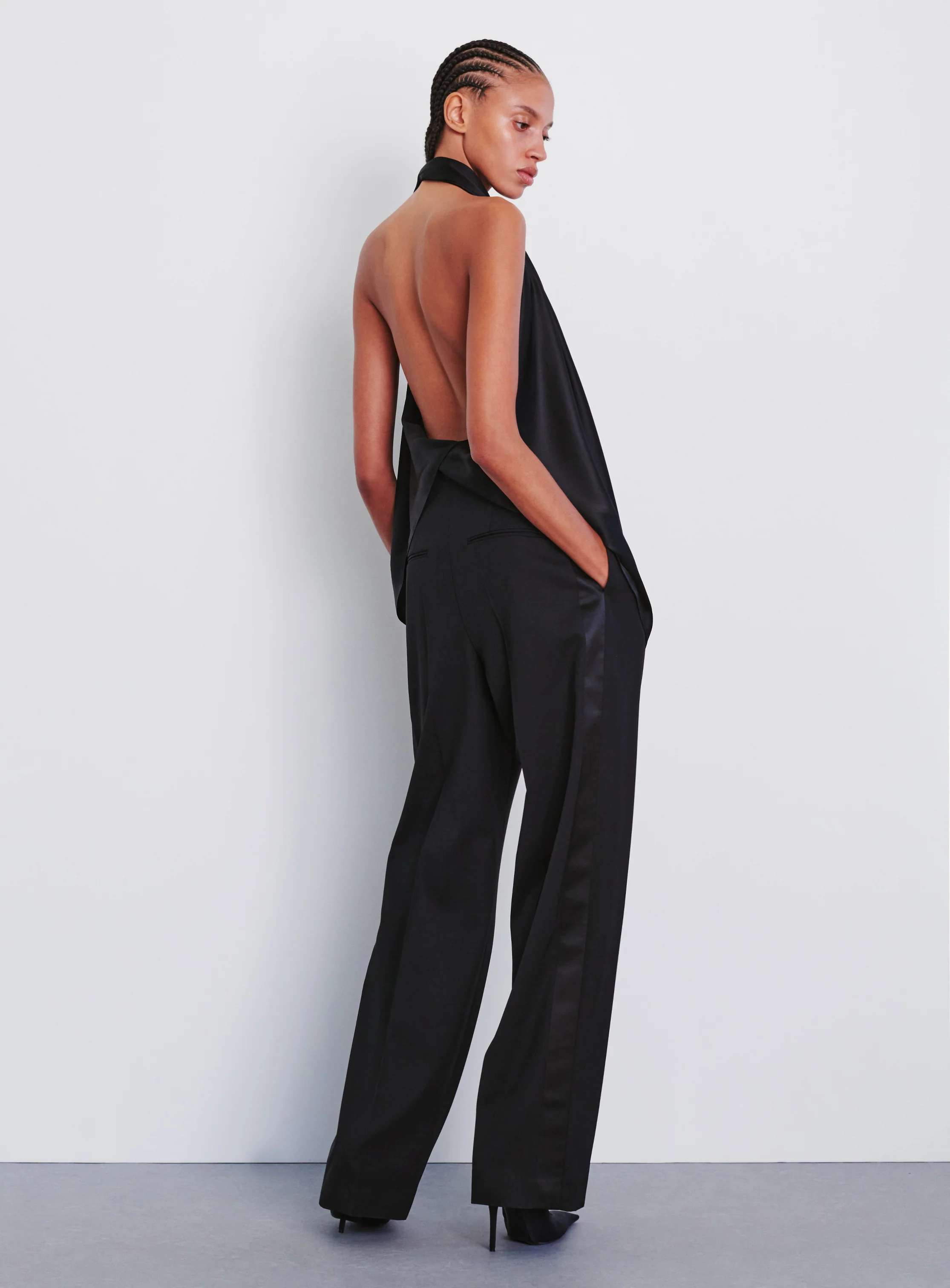 A fluid halter blouse in lustrous Italian silk satin. Features generous fit with draped halter neckline and sleeveless silhouette. Satin cords with metal tips allow custom fit and adjustable styling.