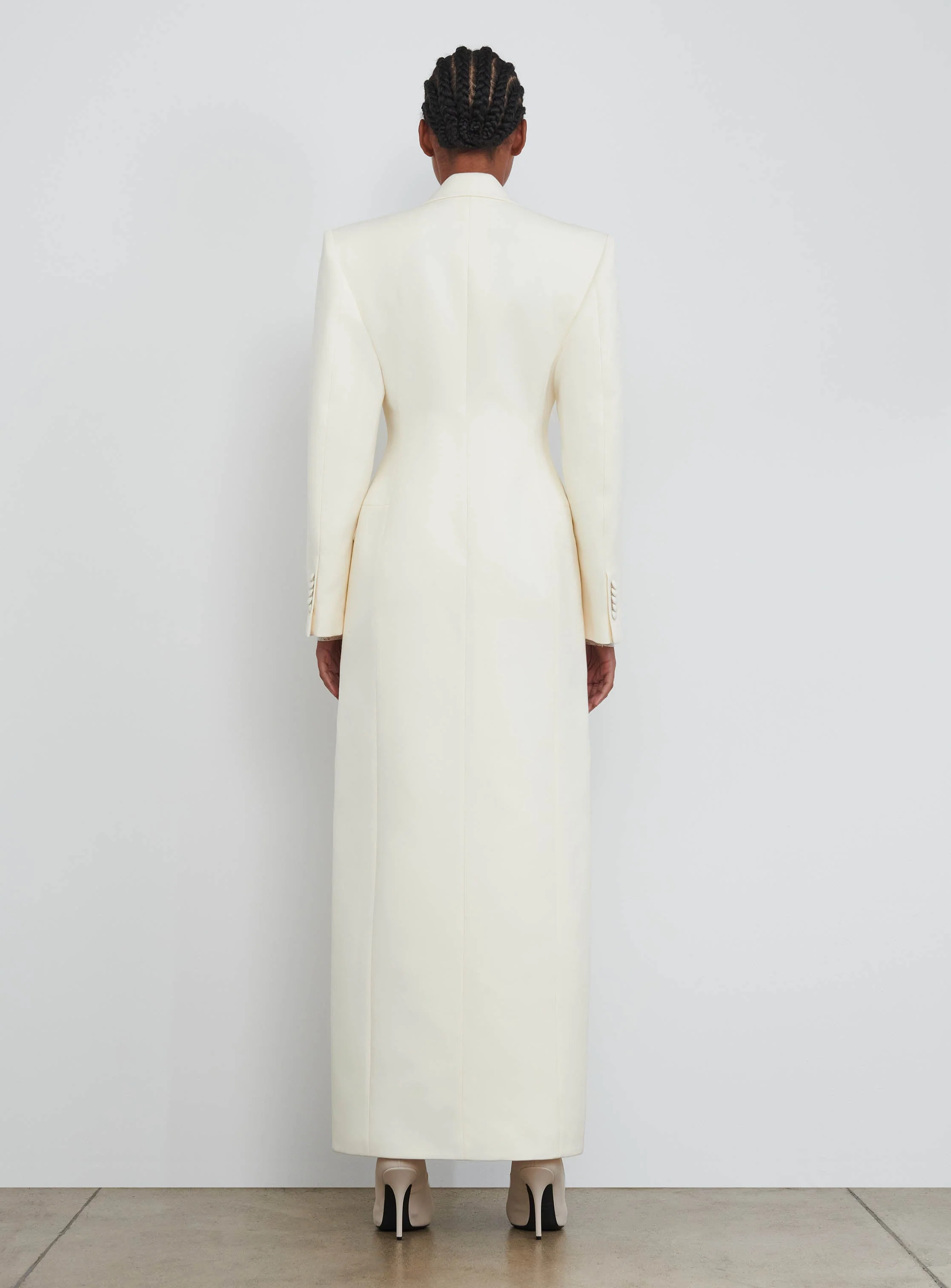 - An elegant, timeless double breasted coat, cut in Italian wool suiting with an Italian silk duchesse lapel. Double breasted with statement shoulders, elongating lines to the ankle, and a subtle split at centre front. Style with our Sheer or Lace Bodysuit and Tight. Available in black and off-white.