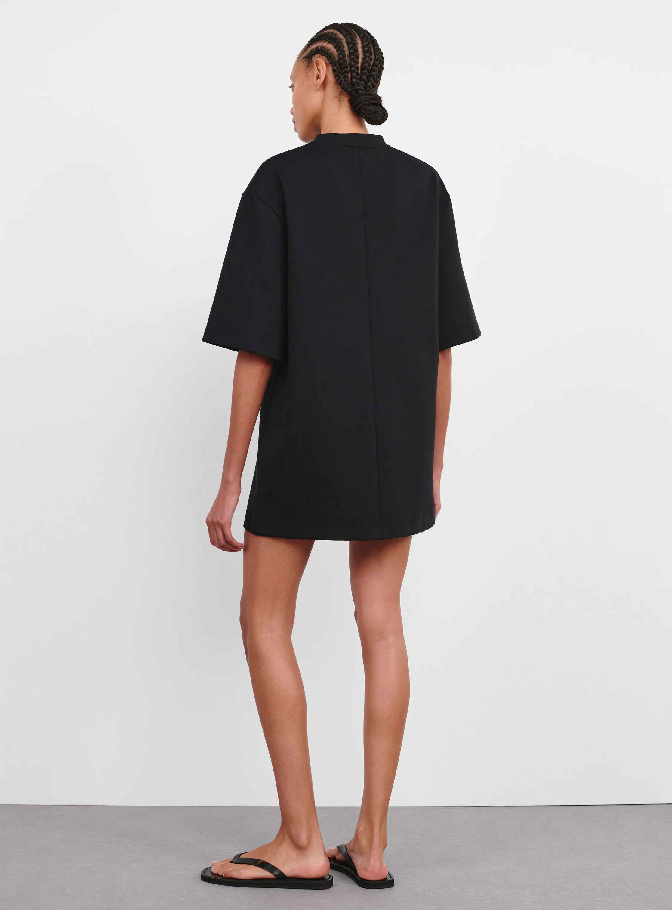 - A refined mini dress, designed with a loose tent silhouette and dropped shoulders. Cut in Italian cotton technical jersey selected for its matte finish and structured yet breathable quality. Features include a simple crew neck and wide elbow-length sleeves. The abbreviated length offers versatile styling options.