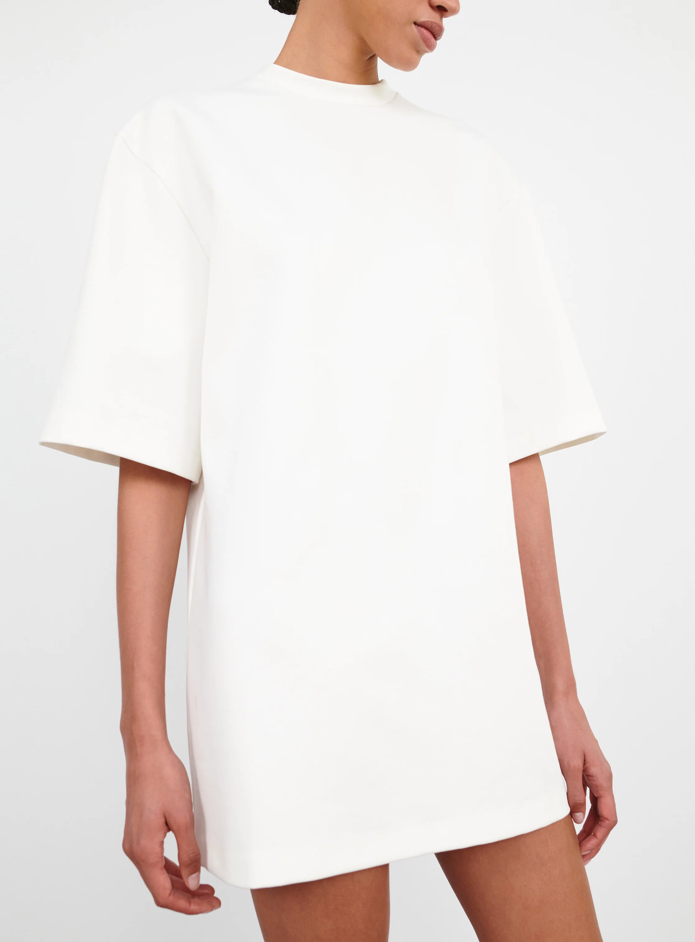 A refined mini dress, designed with a loose tent silhouette and dropped shoulders. Cut in Italian cotton technical jersey selected for its matte finish and structured yet breathable quality. Features include a simple crew neck and wide elbow-length sleeves. The abbreviated length offers versatile styling options.