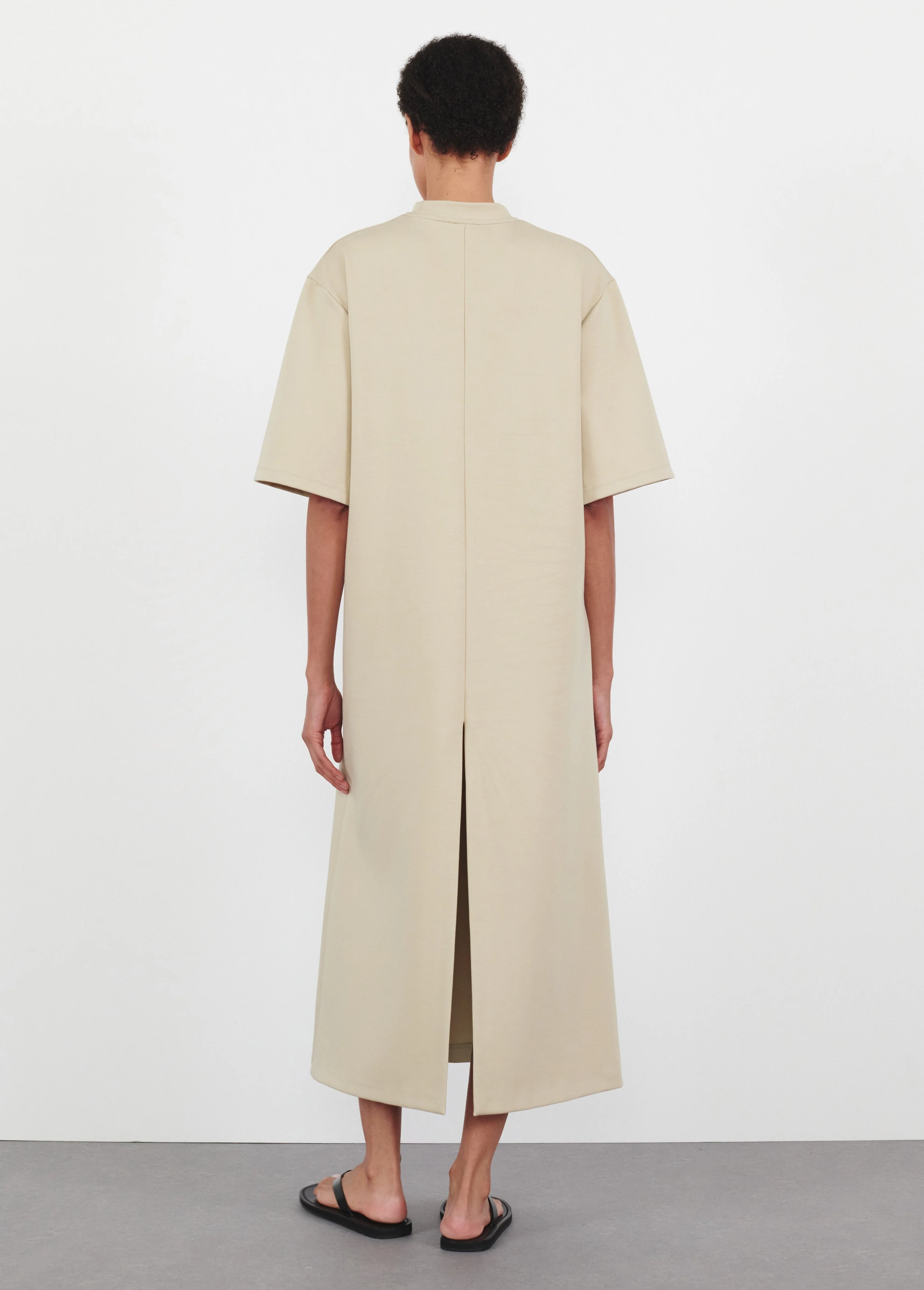 - A minimal dress, designed with a loose tent silhouette and dropped shoulders. Cut in Italian cotton technical jersey chosen for its matte finish and shape-retention properties. Features include a clean crew neck and wide elbow-length sleeves. The over-the-knee length creates a composed presence.