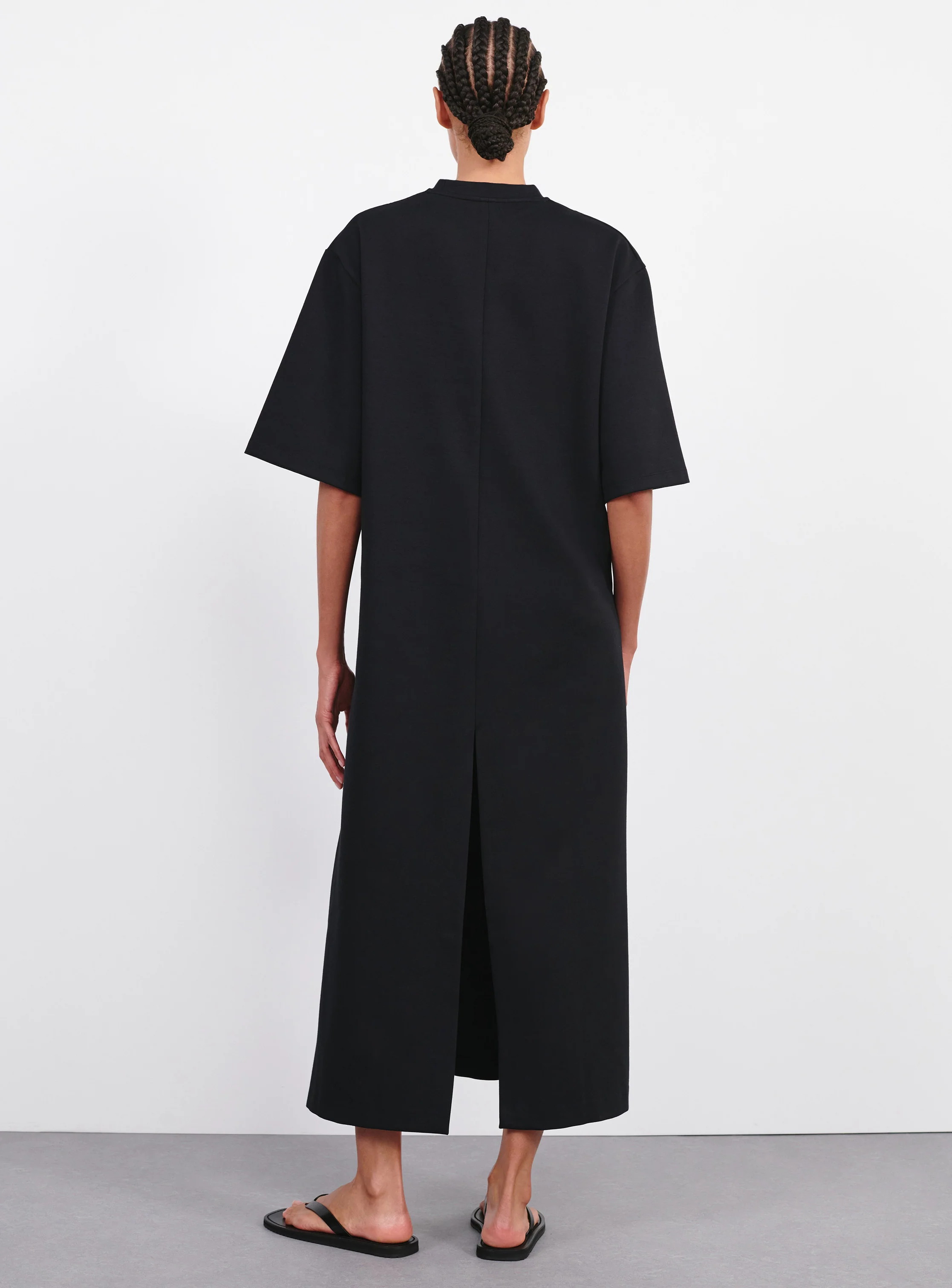 - A minimal dress, designed with a loose tent silhouette and dropped shoulders. Cut in Italian cotton technical jersey chosen for its matte finish and shape-retention properties. Features include a clean crew neck and wide elbow-length sleeves. The over-the-knee length creates a composed presence.