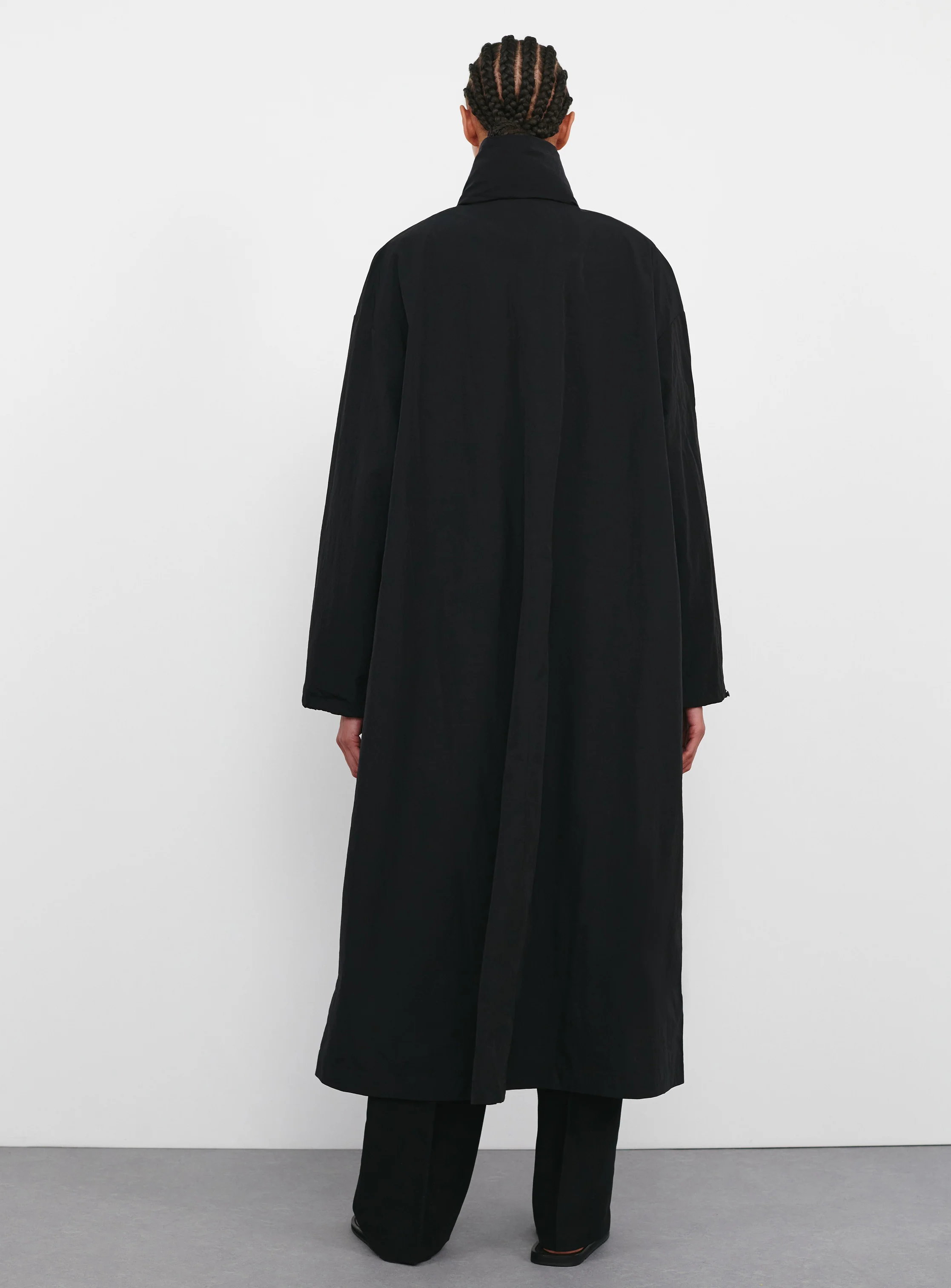 - A considered raincoat, designed with slightly oversized proportions and an a-line silhouette. Cut in Italian technical nylon chosen for its water-resistant properties and translucent, crinkled character. Features include a funnel neck with packable elasticated hood and center front zipper closure. The relaxed dropped shoulders and elasticated cuffs create refined ease.